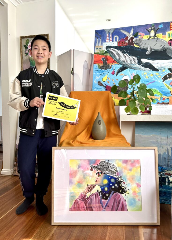 Dylan has started learning with us 3 years ago, and during the this time he has learnt a lot of drawing and painting techniques, and has created many incredible pieces, including ‘What you throw into the ocean with end up in your tummy’ which has won Young Australian Art Awards 2021. This is an amazing achievement, as the artwork has been awarded after judges review more than 30,000 submissions in his age group.
